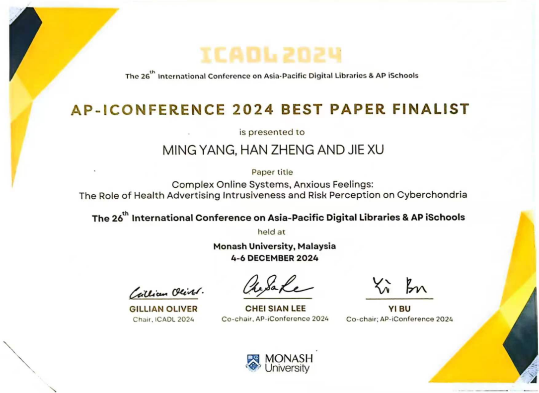 At the award ceremony, the article Complex online systems, anxious feelings: The role of health advertising intrusiveness and risk perception on cyberchondria, authored by master student Ming Yang under the supervision of Han Zheng and Jie Xu, was selected as a Finalist of the Best Paper Award, placing second. This achievement highlights the academic influence and research strength of our school in the fields of digital library and information behavior.