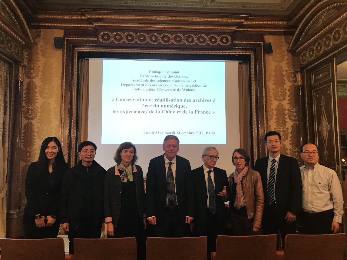 10月23至24日,在《yl23455永利官网与法国海外科学研究院关于“国际合作培育项目”的协议》框架下,《数字时代的档案保管和再利用—中法两国的实践》学术研讨会分别在法国档案学院(Ecole des Chartes)和法国海外研究院(Académie des sciences d’outre-mer)举行。法国档案学院校长Michelle Bubenicek教授、永利官网副院长周耀林教授、法国海外科学研究院秘书长Pierre Gény分别致辞,会议由法国档案学院教授、法国海外科学院前任院长、法国骑士勋章获得者Bruno Delmas院士主持。研讨会上,中法档案专家围绕两国的档案保管和再利用、数字人文等领域展开了深入系统的研讨交流。法国档案跨部门服务中心的专家学者Christine Nougaret从中心职能、AD-ESSOR计划和数字存档系统等方面介绍了法国地方政府数字存档情况。法国国家档案馆科学支持部门主任Beatrice Herold强调了保护原生数字档案和历史上已经形成的数字化遗产的重要性,主张促进跨部门合作以更好地保护数字档案。法国学者Bertrand Caron阐述了数字时代如何收集和获取公共档案的国家性策略,提出要在法律法规中加强档案的作用、确保可持续收集档案和民众可以以新型方式查阅档案。此外,与会法国专家学者还从数字存储风险周期管理、旧报纸的数字化和再利用、当代法国档案通讯概况以及研究人员的协作对档案发展的贡献等方面做了详细报告。永利官网周耀林教授对我国档案局工作的“三个体系”的背景与内容进行了梳理和报告。此后,他专门报道了当前非物质文化遗产档案信息资源存储与组织现状、相关研究成果,并在此基础上,提出了基于本体的面向用户需求的多源异构非物质文化遗产档案信息资源语义检索模型及其实现路径。王晓光教授通过阐释数字人文研究的意义及核心价值,以敦煌壁画数字化为例构建敦煌壁画图像高层本体模型和信息层次模型以及图像标引信息的结构化组织模型并对其模型进行了有效的实验验证。王平副教授对比了现有电子档案元数据封装的主流标准,在总结其不足之处的基础上提出了基于数字取证技术的电子档案元数据封装模型,并以浙江档案网历史图库档案为例验证了模型的有效性。王玉珏博士通过对比分析我国档案法修订前后的变化,分析了我国档案法的内容与特点。