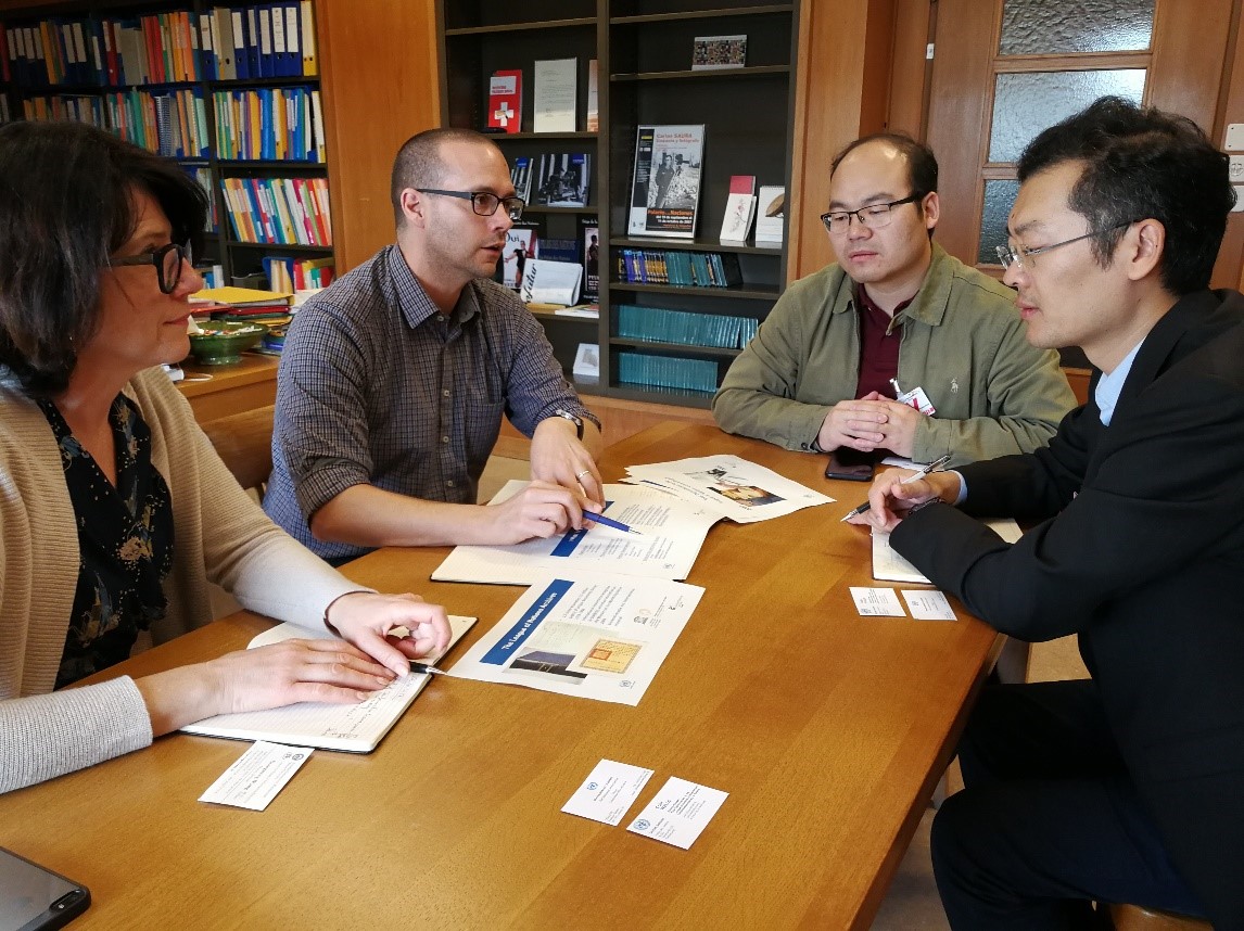 2017年10月21日,受外方合作单位法国海外科学研究院秘书长Pierre Gény和联合国驻日内瓦档案办事处邀请,永利官网周耀林教授、王晓光教授、王平副教授及王玉珏博士前往欧洲,参加了《数字时代的档案保管和再利用—中法两国的实践》专题研讨会,并洽谈了国际合作交流项目;就选派优秀教师、学生前往联合国驻日内瓦图书馆档案办事处等国际组织进行访问和实习进行了深入交流并初步达成意向。